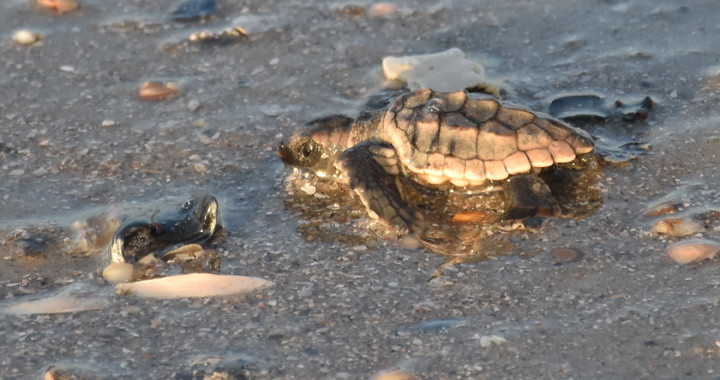 Nest #24 was also found at Mariner’s Walk in Wild Dunes three days later on July 5 by Eileen Montanero and Shree Beverly and this one was relocated just north of 28th Avenue. Even though this was laid three days after Nest 22, they hatched the same night. There were 130 eggs that incubated for 49 days before producing turtles. We found 125 empty eggshells, five undeveloped eggs and six live hatchlings that were released to crawl to the water by Penny Gorby and Shree Beverly.