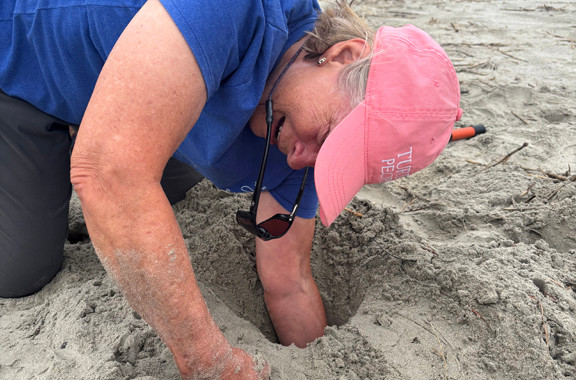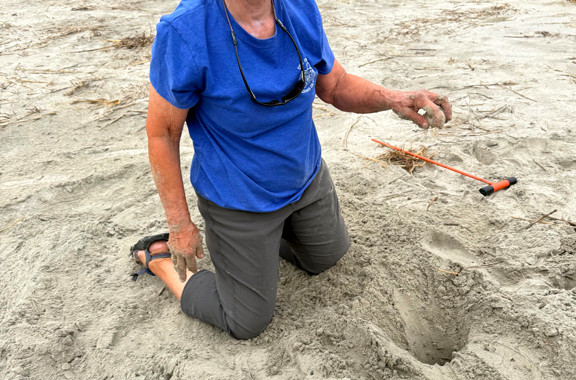 Two Days ago there were five sets of loggerhead tracks on Sullivan's Island between Station 31 and Station 24 Streets. But nothing the next night. However, last night a turtle with the same distance between her rear flippers made a false crawl and also laid 99 eggs just NE of the Fort Moultrie Station 13 access path. Jenn Gragg and Diane Brumley were on patrol just before the rain came and reported these two sets of tracks near the Fort. The eggs were laid in an area that washes over repeatedly below the spring tide line. They were relocated to a new dune near the Sand Dunes Club Path. We are so glad this loggerhead apparently found her spot and laid those eggs which are likely the last of the season with only eleven days left to patrol.